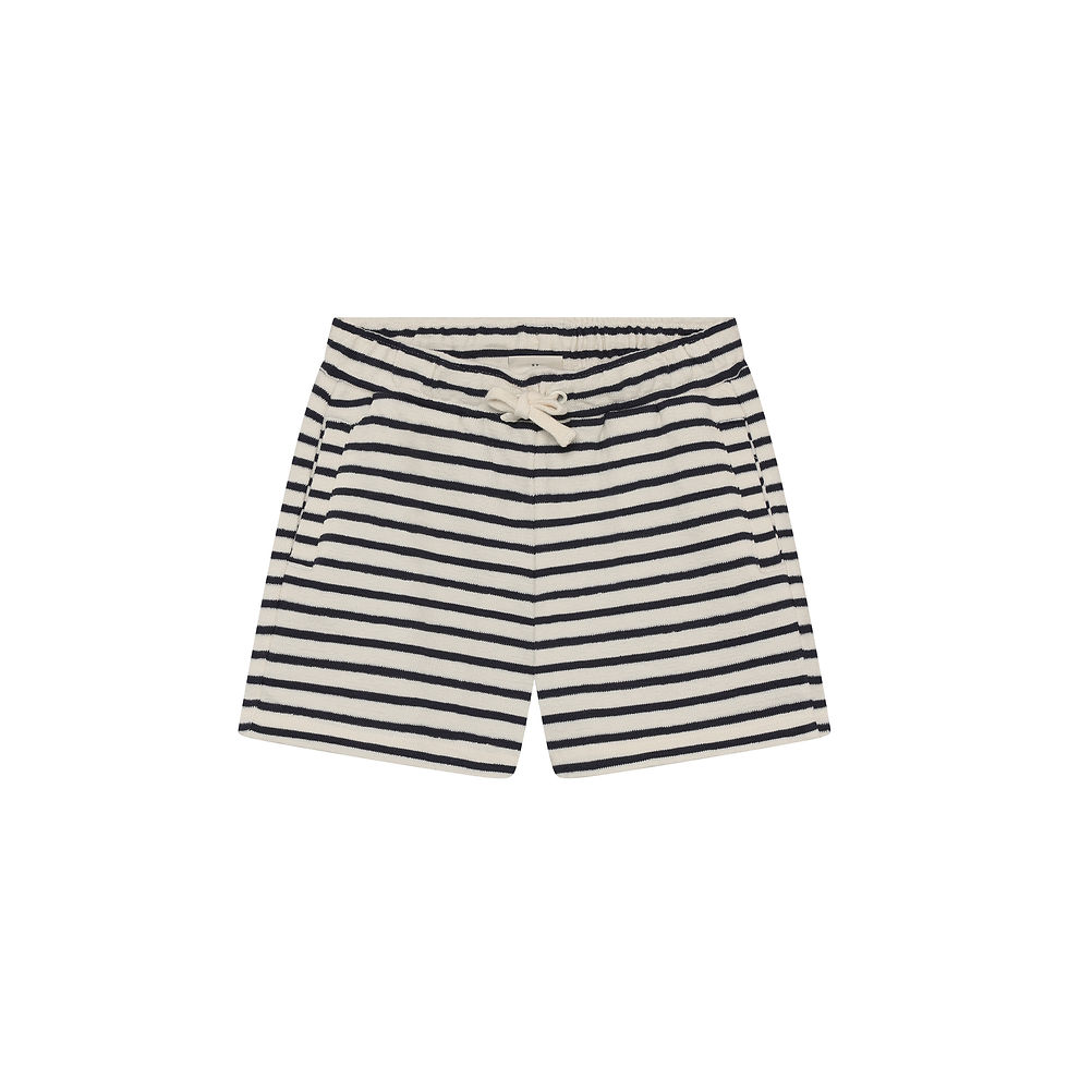 Suit from Minymo. The romper has short sleeves and legs. It is made of yarn-dyed cotton fabric with a striped pattern. The romper has buttons at the front and fastens with snap buttons between the legs. Made with certified organic cotton.